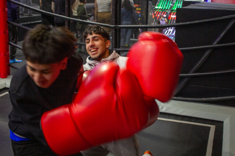 La actividad de Boxing permite que dos participantes entren a un cuadrilátero con cama elastica y boxeen de manera divertida usando guantes acolchados de gran tamaño. Ideal para liberar energía y reír sin riesgos.